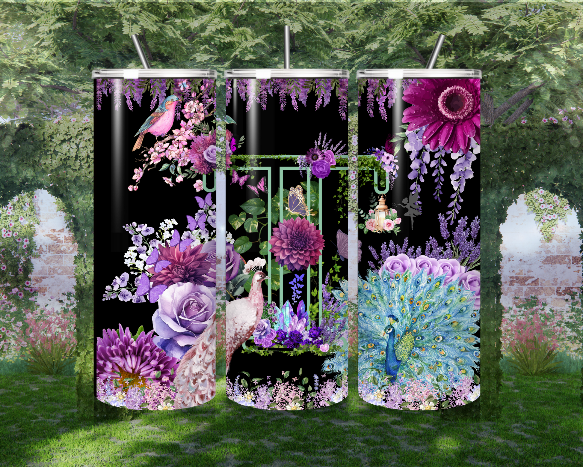 This custom purple garden tumbler is perfect for any nature lover. Featuring a black background with various shades of purple flowers and customizable first name letter, this 20oz tumbler is great for both hot and cold beverages. Please note, hot drinks are not recommended for kids.